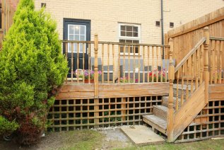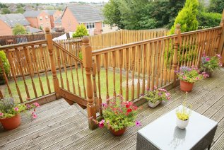 Rear garden with elevated decking that leads to lawn towards the rear of the garden.