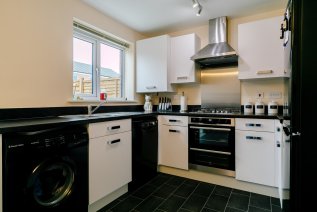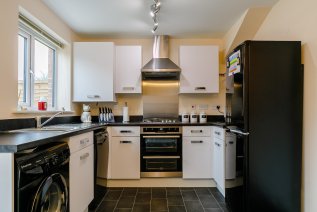 Kitchen / Diner - 15'2 x 8'9 (4.62m x 2.67m) - The kitchen area comprises: a range of contemporary eye level and base units with built-in cupboards and drawers, integrated oven, fridge freezer, four ring gas hob with stainless steel cooker canopy over, space for washing machine and dishwasher, fitted style worktops with inset 1 ½ stainless sink drainer with mixer tap over, cupboard housing gas fired central heating boiler, upvc double glazed window to rear and vinyl tiled effect floor covering.