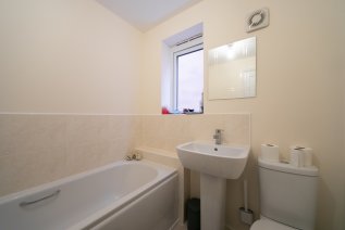 Bathroom - Having a three piece white suite comprising: panelled bath, pedestal wash hand basin, low flush wc, radiator, vinyl wood effect floor covering, upvc double glazed window to side and wall mounted extractor fan.