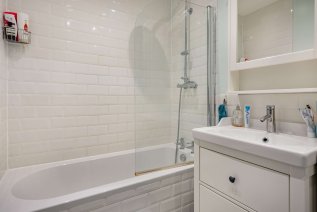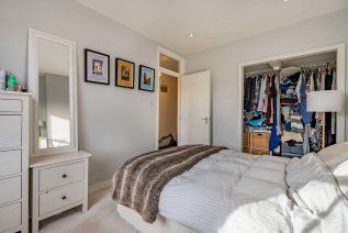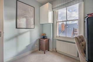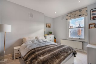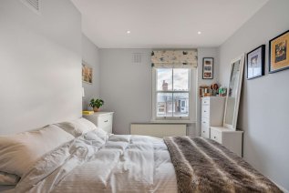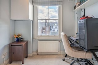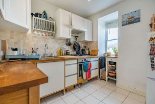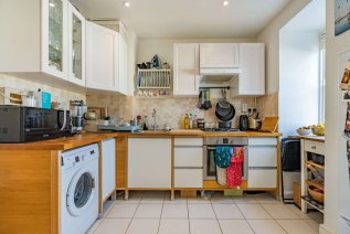 A striking Victorian exterior greets you upon arrival, and a handful of steps guides you to the jet black front door. An interior design beaming elegance, character, and comfort welcomes you inside this second floor apartment. Each and every room has been fitted with contemporary recessed spotlighting, with dimmer switches in the living spaces. Linen white walls and light wood effect flooring lines the reception room, accentuating a beautiful deep square bay fitted with an original sash window; ideal for placing a dining table or creating a cosy reading nook. Stepping through a wide arch to your left is the kitchen, which features thick wooden work surfaces that top the lower units. Close attention has been paid to maximise space in this room, boasting slotted racks and wall-mounted bars. Sophisticated storage solutions punctuate the bathroom next door, complete with a full-sized bathtub and dual rainforest showerhead. Further examples of added storage can be found in the master, where the current owners have created a double wardrobe, and in the hallway, where you’ll find an inbuilt cupboard and access to a loft overhead.