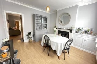 Dining Room - 3.43m x 3.63m (11'3 x 11'11) - Window and door to the front, lino flooring, light point and radiator. Original fireplace and laminate flooring. Utility metre cupboard.