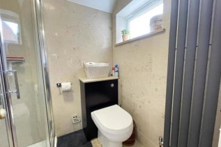 Shower Room - Having window to the side, light point and extractor fan. Tiled floor and walls, Anthracite Vertical Designer Radiator.