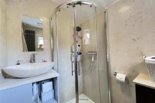 Built-in corner shower cubicle, low flush WC and wash hand basin.