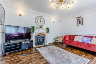 RECEPTION ROOM ONE: 13'11'' (4.24m) (into bay) x 13'10'' (4.22m) (max) Having double glazed bay window to front elevation, central heating radiator, dado rail and the main focal point of the room being a feature fire place with marble effect hearth and back.