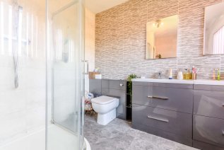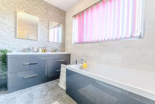 RE-FITTED LUXURY BATHROOM Having double glazed opaque window to rear garden, heated towel rail, complementary splash back tiling and ceramic tiled flooring. The bathroom suite has been re-fitted to comprise a four piece suite of panelled bath, shower cubicle with shower over, and 'his and hers' hand wash basin.