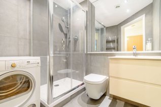 Fully tiled walls, tiled floor, extractor fan, featuring a shower cubical, low level sink and WC.